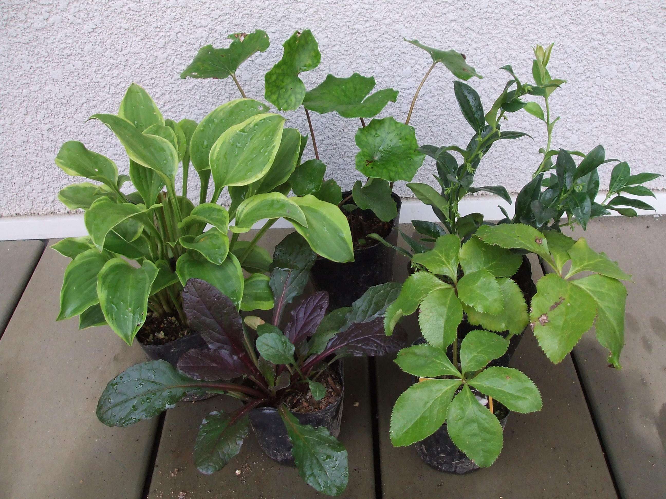 後列左からギボウシ、ツワブキ、サルココッカです