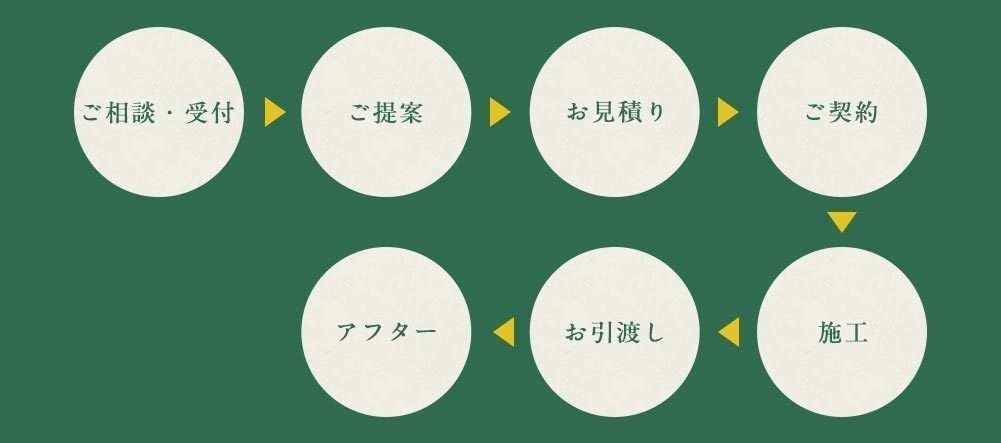 お客様にご相談をいただいてからお引渡しまでは、下記の流れで進行してまいります。細部まで丁寧な施工をお約束いたしますので、安心してお任せください。